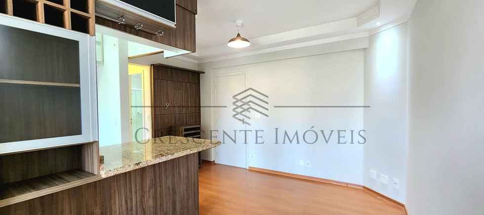 O apartamento tem 63 m² de área privativa, com 2 dormitórios (1 suíte), banheiro social, sala em L, cozinha, área de serviço e varanda com churrasqueira, integrada aos ambientes sociais, móveis planejados e 2 vagas de garagem paralelas.